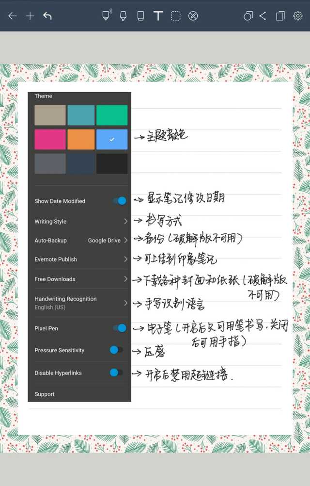 此外,这款笔记软件上还有很多设置相关的选项,使用过程中大家可以根据自己的习惯进行选择,包括左右手的选择、纸张的样式、手写识别语言以及是否使用触控笔等。
