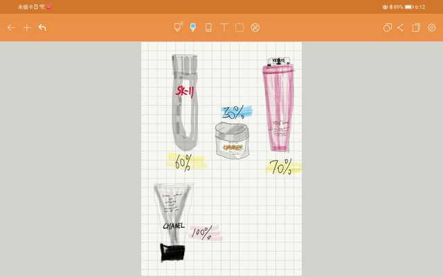 我几乎用到了Noteshelf提供的所有笔刷效果,耗时20分钟,我以我老婆的化妆品为对象完成了个人第一张手账作品,经过我老婆专家级别的鉴定,只要是化妆的女人应该都能认出我画的是什么。