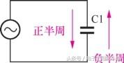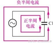 (1)电容通交特性和电容电路分析中的等效理解方法。图1-72是电容在交流电路中的工作示意图,在交流电的正半周和负半周,电路中的电流方向相反,电路中有电流流过,但是电流本身并没有从电容的一个极板直接通过内部到达另一个极板,而是电流在电容外电路中流动。