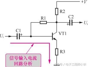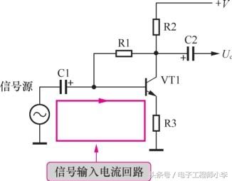 图1-74所示是信号输入回路,见图中的信号输入回路电流示意图,信号输出源上端输出信号电流,经C1耦合加到VT1管基极,从VT1管发射极输出,经电阻R3到地端,通过地线到信号源下端,经信号源内电路成回路。
