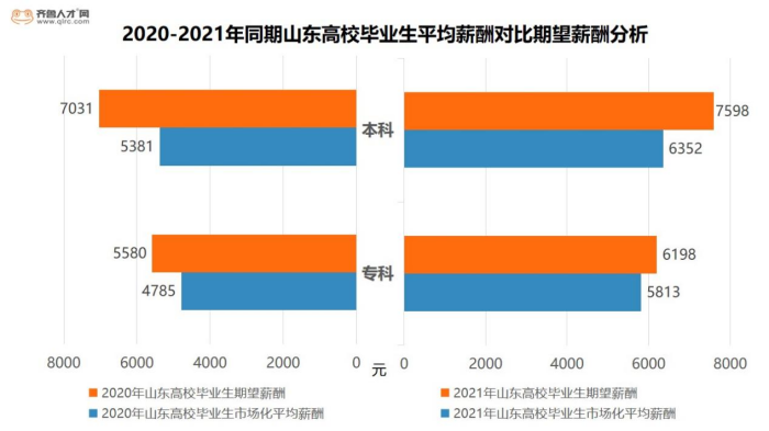 上图所示,本科与专科学历的高校毕业生薪酬呈上涨态势,但均与山东高校毕业生期望薪酬有所差距,其中2021年山东专科学历高校毕业生期望薪酬比专科学历人才市场化平均薪酬高385元,与2020年相比薪酬差距减少410元;而2021年山东本科学历高校毕业生期望薪酬比本科学历人才市场化平均薪酬高1246元。