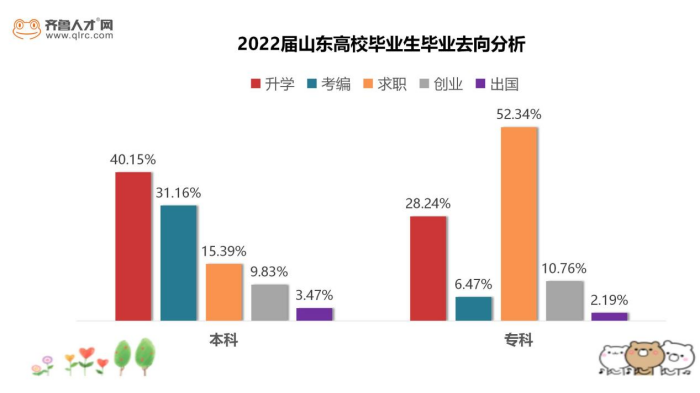 齐鲁人才网对2022届山东高校毕业生毕业去向进行数据调查中发现:本科学历的高校毕业生选择升学的比例最大,占比40.15%;考编意向其次占比31.16%;求职与创业的毕业生各占15.39%和9.83%。专科学历的高校毕业生选择就业的学生比例最大,占比为52.34%;紧跟其后是升学意向占比为28.24%;创业意向为10.76%,排名第三位;考编及出国意向分别占比6.47%、2.19%。近年来的“考研热、考编热”促使毕业生持续增加,就业意愿在降低,本科学历毕业生慢就业成为主流,而山东专科学历毕业生就业意向强烈。