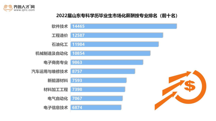 根据齐鲁人才网数据显示,可以清楚地看到山东专科学历毕业生市场化薪酬按专业排名,软件技术专业以14465元稳居第一位;工程造价专业以12587元紧跟其后,石油化工与机械制造及自动化专业分别以11984元、10854元在第三位与第四位。由此可见山东市场化经济发展的宏观版图中对相关专业的需求依旧很大。