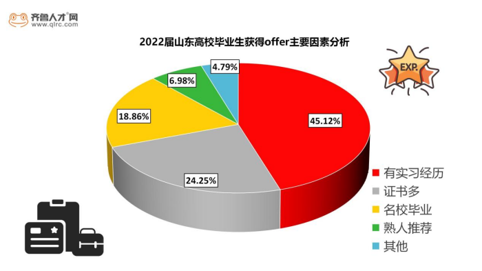 根据齐鲁人才网数据显示,2022届山东高校毕业生在求职过程中,有实习经历毕业生的获得offer的占比45.12%;证书多排名第二占比24.25%;名校毕业第三位占比18.86%。这表明企业在招聘应届毕业生时,会关注毕业生的实习经历,并会偏爱于有实习经历的毕业生。