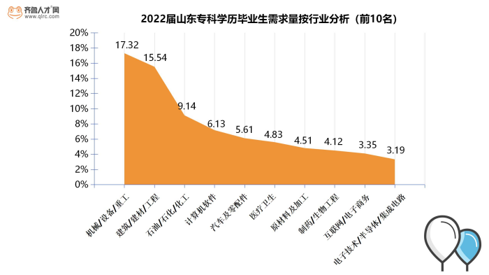 根据齐鲁人才网数据显示,2022届山东专科学历高校毕业生需求量行业分析排名可以看出,机械/设备/重工行业需求量占比最高,为17.32%;紧跟其次的是建筑/建材/工程行业,需求量占比为15.54%;第三名是石油/石化/化工行业,需求量占比为9.14%;同时,计算机软件行业需求量也得到了极大提升,排名第四位占比为6.13%。