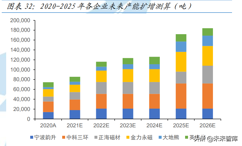 目前我国高性能钕铁硼永磁材料厂有大量扩产计划,侧面印证下游需求的高景气度。由 于钕铁硼永磁材料为非标准化产品,涉及新材料、新工艺和新产品的研发,钕铁硼生产商往 往需根据下游客户对产品的需求而制定相关的生产计划。例如,新能源车企往往会提供相关 电机的技术参数和产品规格,钕铁硼生产商需根据客户提供的参数进行定制化设计和批量生 产。截止 2021 年年底,我国主要高性能钕铁硼生产商包括宁波韵升(年产能 1.4 万吨)、中 科三环(年产能 2.15 万吨)、正海磁材(21 年年底投产后已达 1.5 万吨产能)、金力永磁 (21 年产能 1.5 万吨,22 年二季度预计可达 2.3 万吨产能)、大地熊(21 年年底已达 6,000 吨产能)和英洛华(年产能 1 万吨)。根据目前公开披露口径,以上企业均有相应的扩产计 划,预计六家企业总产能将由 2020 年的 7.45 万吨增至 2026 年的 18.4 万吨,CAGR 达 16.3%; 由于许多高性能钕铁硼产品为定制化或非标准化产品,企业扩产的决心也间接印证了下游终端行业的需求高景气度。