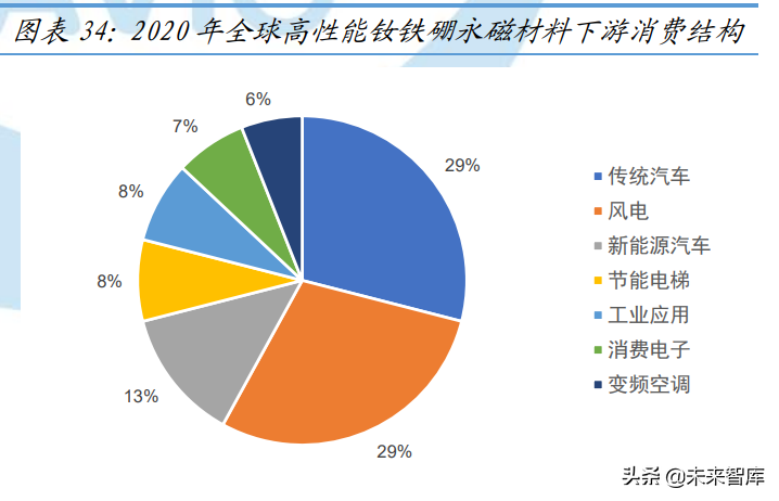 根据上海有色网数据显示,2020 年全球高性能钕铁硼磁材下游应用按需求占比来算,传 统汽车、风力发电及新能源汽车的钕铁硼需求量占比最高,分别为 29%、29%、13%,其他还包 括节能电梯、变频空调、消费电子和工业机器人及智能制造等终端应用。以下将对这七块下 游需求的钕铁硼用量进行逐块拆分分析,并对各板块未来高性能钕铁硼需求进行测算;