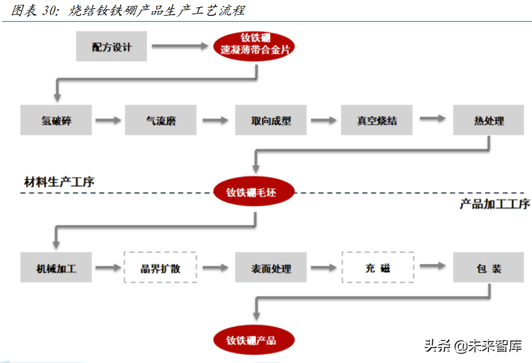 目前钕铁硼永磁材料产品以烧结钕铁硼为主。钕铁硼永磁体是以 Nd2Fe14B 相为主要磁性 相的永磁材料,具体成分包括 29%-32.5%的稀土金属钕,63.95-68.65%的金属元素铁,1.1- 1.2%的非金属元素硼,0.6-8.0%的镝,0.3-0.5%的铌,0.3-0.5%的铝以及 0.05-0.15%的铜等。 钕铁硼作为第三代永磁材料,具有高剩磁密度、高矫顽力和高磁能积的特点。根据生产工艺 的不同,钕铁硼永磁材料可分为烧结、粘结及热压钕铁硼永磁材料。烧结、粘结和热压钕铁 硼在性能和应用上各具特色,下游应用领域重叠范围比较少,相互之间更多起到功能互补而 非替代或挤占的作用。据中国稀土行业协会数据,2020 年我国生产的稀土永磁材料中,包括 烧结钕铁硼磁体 17.85 万吨,粘结钕铁硼 7372 吨,钐钴磁体 2232 吨。由此可见,烧结钕铁 硼占据目前稀土永磁材料 90%以上的份额,为主流的钕铁硼永磁体。烧结钕铁硼由粉末冶金 工艺制成,因其具有较高的磁能积和内禀矫顽力而被广泛应用于传统汽车工业、新能源车电 机及工业电机等诸多领域。