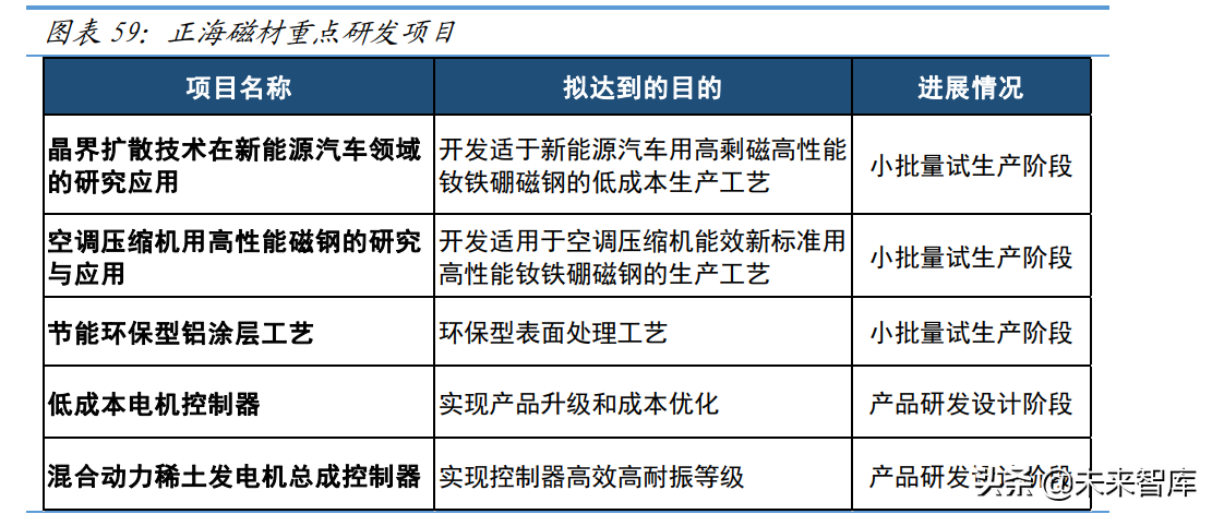 公司的“正海无氧工艺(ZHFOP)”为我国钕铁硼生产技术做出卓越的贡献,近年来在同 行中始终保持较高的研发投入占比。由于稀土金属在钕铁硼的生产过程中极易被氧化,容易 影响钕铁硼永磁材料的性能,公司在业内首倡正海无氧工艺理论,大幅降低产品氧含量,并 率先实现产业化,引领我国钕铁硼生产技术达到国际先进水平。据公告披露,公司在多个生 产工艺及成本控制项目中持续保持研发投入,包括晶界扩散技术的研发、高性能钕铁硼磁钢 生产工艺等;公司 2018-2020 年研发投入占营收比例分别为 5.98%、7.03%、7.25%,处于业内 领先地位。伴随公司的规模化扩产计划,公司产品业务在未来有望实现进一步降本增效。