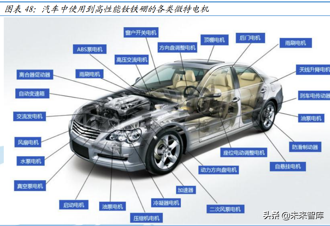 传统汽车中的微特电机将持续牵动钕铁硼下游需求。汽车零部件中有大量的微特电机会使用到高性能钕铁硼,包括电动助力转向系统(EPS)、防抱死制动系统(ABS)、汽车油泵、 点火线圈等。目前我国汽车 EPS 渗透率约在 66%,未来渗透率有望达到 80%以上。随着我国汽 车产量的增加,叠加 EPS 和 ABS 等零部件在汽车中的渗透率不断提高,汽车零件所驱动的钕 铁硼永磁材料需求将稳步上升;