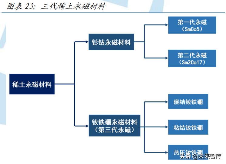 钕铁硼永磁材料是目前应用最广泛的稀土永磁材料。自 20 世纪 60 年代面世以来,稀土 永磁材料经历了近 60 年的发展,随着材料的迭代而衍生出了具有实用价值的三代稀土永磁材 料,永磁材料的磁性能也陆续实现了三次重大突破。第一代钐钴永磁材料以 SmCo5 合金为代 表,第二代钐钴永磁材料以 Sm2Co17 合金为代表,第三代稀土永磁材料以 Nd2Fe14B 合金为主 要代表。其中,第一代和第二代稀土永磁材料统称为钐钴永磁材料,第三代统称为钕铁硼永 磁材料。与钐钴永磁材料相比,钕铁硼永磁材料在磁性能和生产成本方面具备较大优势,能 够满足大规模、多规格的工业化生产需求。因此,钕铁硼永磁材料是如今永磁材料中综合素 质最优的稀土永磁体,同时也是现在产量最高、应用最广泛的稀土永磁材料;