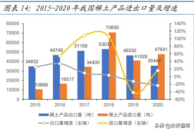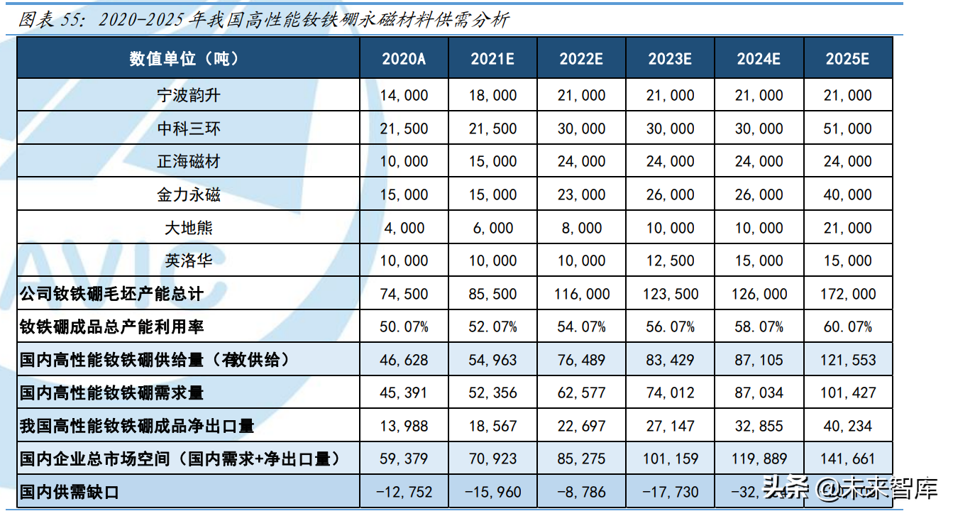 通过对比国内高性能钕铁硼供给量(有效供给)和国内企业总市场空间(国内需求+净出 口量),即可计算出我国高性能钕铁硼供需缺口。(报告来源:未来智库)