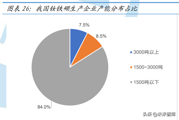 我国钕铁硼永磁材料产能结构面临高端供给不足、中低端产量过剩的局面。根据行业惯 例,内禀矫顽力(Hcj,kOe)和最大磁能积((BH)max,MGOe)之和大于 60 的烧结钕铁硼永磁 材料,属于高性能钕铁硼永磁材料,其余为中低端钕铁硼。从终端应用来看,中低端钕铁硼 多用于箱包扣、门扣、玩具、磁选等领域,而高性能烧结钕铁硼下游应用领域包括传统汽车 EPS、新能源汽车驱动电机、风力发电、变频空调、节能电机、机器人及智能制造等。我国高性能钕铁硼永磁材料年产量约占钕铁硼毛坯 总产量的 25%;从我国钕铁硼市场格局来看,国内有约 170 家烧结钕铁硼生产企业,近十年 来我国烧结钕铁硼产量的平均年增长率约为 14.0%。从企业产能来看,我国烧结钕铁硼年产 能达 3000 吨以上的企业仅占 7.5%,产能在 1500-3000 吨的企业仅占 8.5%,剩余 84%的企业 产能均在 1500 吨以下。