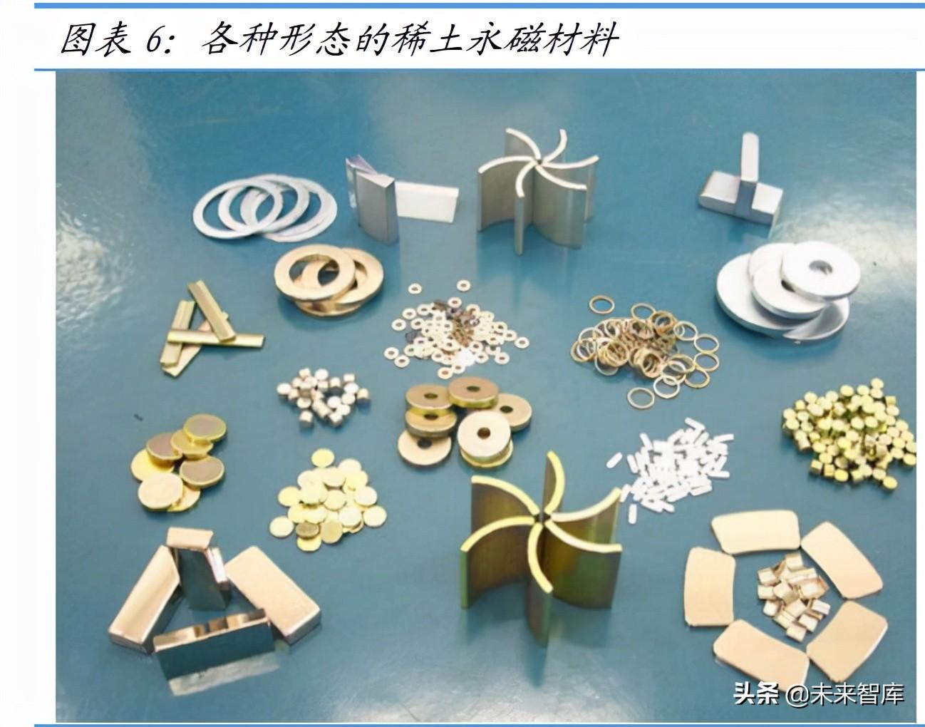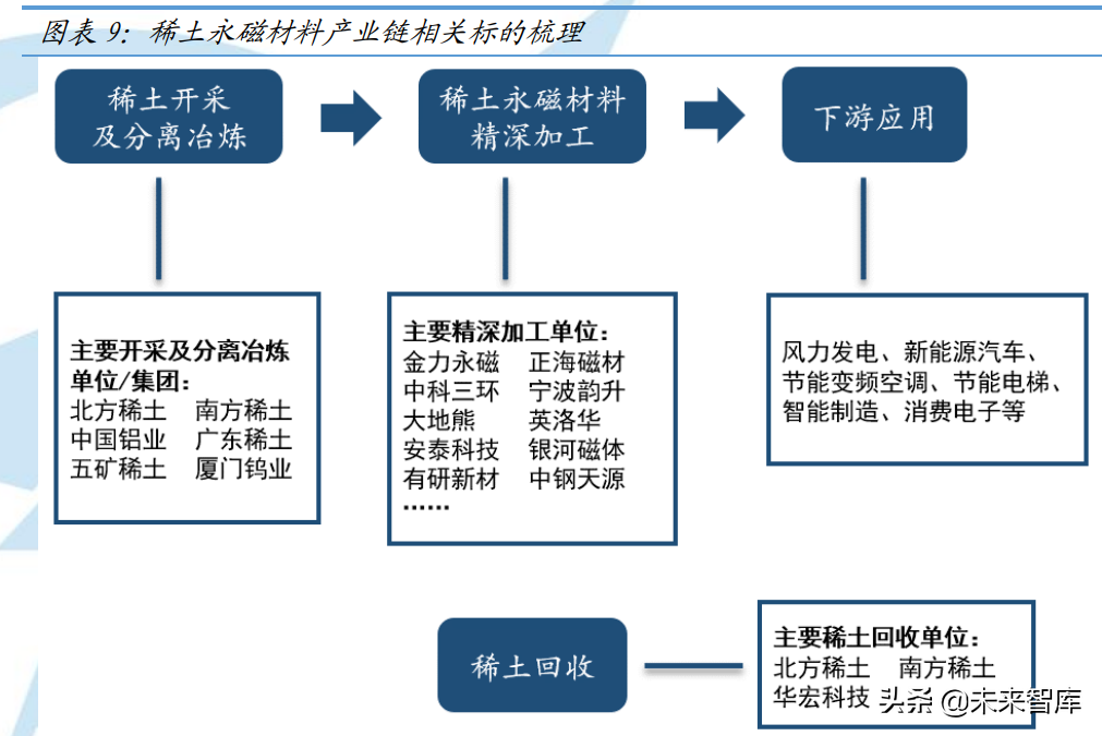 稀土产业链涵盖了上游的稀土矿资源的开采、冶炼分离,中游各类稀土材料的精深加工, 以及下游终端应用领域三大块。上游稀土原矿的开采主要包括轻稀土矿和中重稀土矿的采掘; 原矿石经冶炼分离后可得到稀土氧化物,随后通过火法冶金或湿法冶金技术便能形成稀土化 合物或单一稀土金属。在产业链中游,稀土金属及稀土氧化物再被进一步精密加工成稀土永 磁、催化、发光材料等多类稀土材料。随后,稀土材料可被应用至各类下游稀土应用端—— 以稀土永磁材料中的高性能钕铁硼永磁材料为例,其终端应用包括风力发电、新能源汽车、 节能家电、机器人及智能制造等领域;