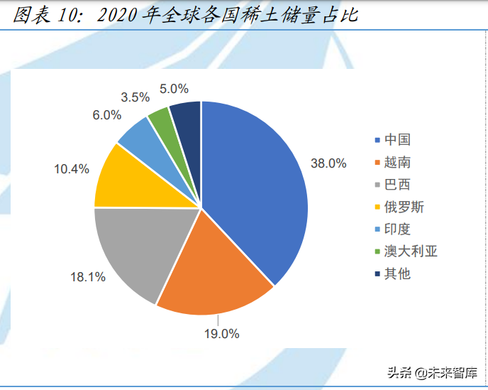 我国具有全球最大的稀土储备。据美国地质调查局(USGS)最新数据显示,2020 年全球 稀土储量折合稀土氧化物约为 1.2 亿吨,其中,我国稀土储量为 4400 万吨,占比 38.0%,稳 居第一;越南储量 2200 万吨,占比 19.0%;巴西储量 2100 万吨,占比 18.1%;俄罗斯储量 1200 万吨,占比 10.4%;全球前四国稀土储量之和占比高达 85%。从地理位置来说,我国稀土 资源呈现“北轻南重”的特点。轻稀土矿以内蒙古包头的白云鄂博矿为代表,主要分布在我 国北方地区和四川凉山,其储量超过全国轻稀土资源的 80%;离子型中重稀土矿主要分布在 福建、江西、广东、云南等南方地区,其储量占我国重稀土资源的 90%,其中江西赣州和广东 粤东的中重稀土储量较大,分别为 57 万吨、50 万吨,占中重稀土总储量的比例为 44%、38%。 得益于我国丰厚的稀土资源储备,目前我国重稀土金属氧化物年产量在全球范围内仍处于主 导地位;