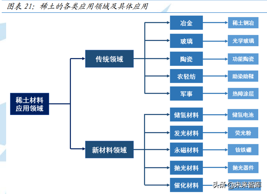 稀土被誉为“现代工业维生素”、“新材料之母”,终端应用领域十分广泛。上游加工而 成的稀土金属及稀土氧化物主要由稀土产业链中游的精深加工企业所消化,经不同的加工工 艺制成的稀土材料可被应用至诸多不同的终端领域。稀土材料的下游需求按大类可被分为传 统领域和新材料领域两大块。传统应用领域包括冶金工业、石油化工、玻璃陶瓷、农轻纺及 军事领域等;而在新材料领域中,不同稀土材料相对应的则是不同的下游细分赛道,例如稀 土永磁材料可被广泛应用于信息产业中的各类电子设备及新能源领域中的各类电机及零部件, 稀土储氢材料可被应用于电池储氢产业,稀土发光材料则可被应用于荧光器件等;