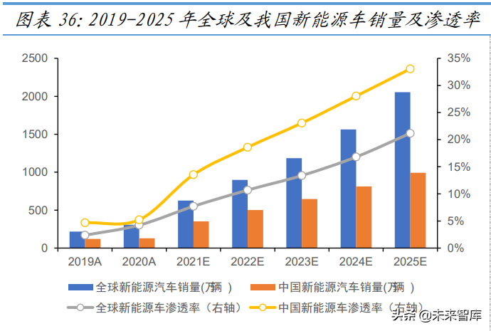 根据产业信息,每辆新能源车的稀土永磁同步电机中的钕铁硼用量为 2-5kg,此处我们假 设单车电机钕铁硼用量为 3kg。据中航证券先进制造团队对 2021-2025 年新能源车销量的预 测,可以推算出,我国新能源车钕铁硼用量分别为 1.06/1.51/1.94/2.44/2.98 万吨,CAGR 为 29.6%;海外新能源车钕铁硼用量分别为 0.82/1.19/1.61/2.25/3.19 万吨,CAGR 为 40.3%。