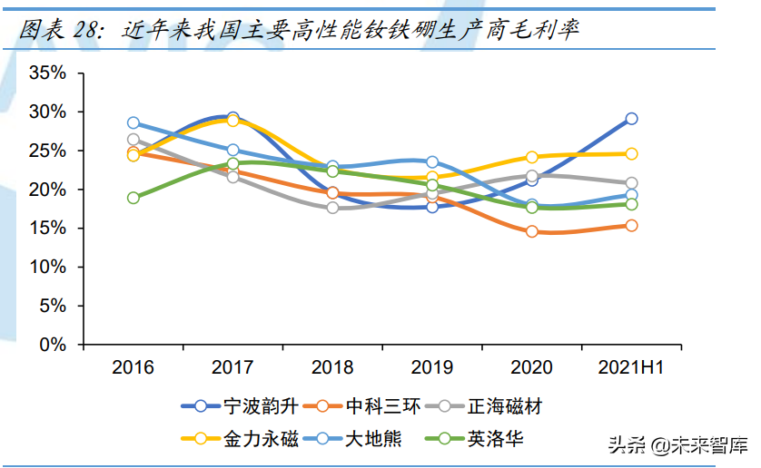 目前市场上能够稳定生产高性能钕铁硼的企业主要包括宁波韵升、中科三环、正海磁材、 金力永磁、大地熊和英洛华等。六家企业的销售毛利率在近年来分化不大,但宁波韵升的销 售毛利率自 2019 年起经历了较大幅度的上升,主要受益于三方面:1)稀土价格上涨所带来 的原材料库存收益能被传导至下游客户,帮助增厚公司产品毛利率;2)公司加强内部控制, 推动降本增效,提升生产效率;3)公司用于汽车应用的钕铁硼永磁材料增长迅速,并在新能 源车领域获得了多个国内外主驱电机厂及汽车配套的供应商资格,实现批量供货。总体来看, 我国高性能钕铁硼生产企业由于在技术、资金及客户认证方面均具有一定的壁垒,企业数相 对较少,毛利率一般在 20%以上;而中低端钕铁硼主要由大量中小企业生产,由于中低端钕铁 硼生产的技术壁垒偏低,竞争较为激烈,毛利率一般低于高性能钕铁硼厂商。就我国钕铁硼 永磁材料发展前景来说,高性能钕铁硼市场不论从未来供给端的扩产还是需求端的增长来说, 均有较大提升空间,这也为国内高性能钕铁硼生产企业提供了诸多成长机遇;