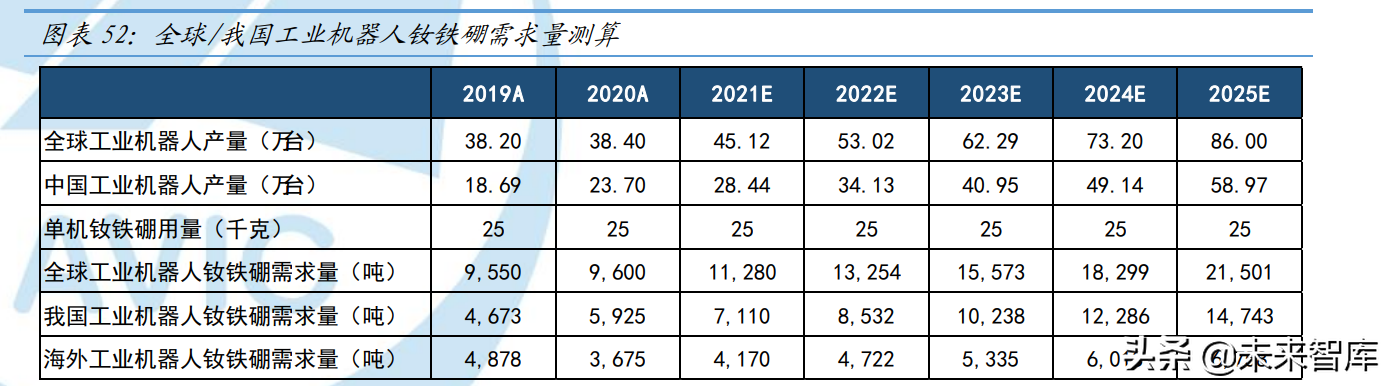 我国为工业机器人生产大国,2020 年全球工 业机器人产量为 38.4 万台;工信部数据显示,2020 年我国工业机器人产量为 23.7 万台。若 以机器人单机消耗钕铁硼 25kg 来计算,根据历史数据,假设 2021-2025 年工业机器人在我国 的产量 CAGR 为 20%,全球产量 CAGR 为 17.5%,测算可得 2021-2025 年我国工业机器人钕铁硼 用量分别为 0.71/0.85/1.02/1.23/1.47 万 吨 , 海 外 工 业 机 器 人 钕 铁 硼 用 量 分 别 为 4,170/4,722/5,335/6,013/6,758 吨。