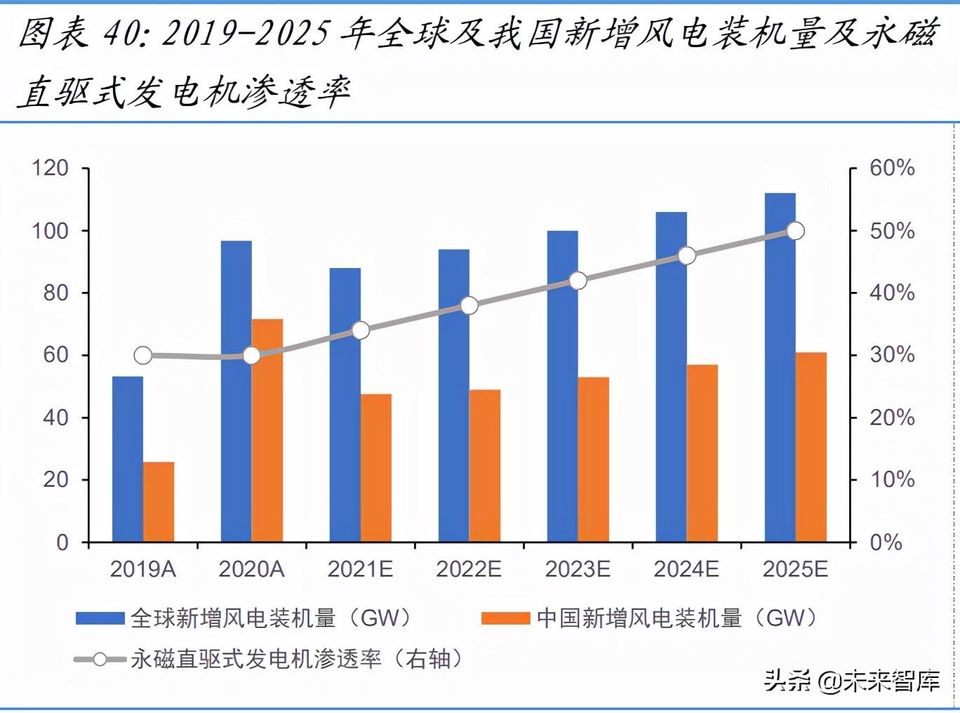 风力发电作为应用最广泛和发展最快的新能源发电技术之一,在国家政策的大力扶持下 将保持稳步增长。加快开发和利用可再生能源已在国际上达成共识,能源结构调整对节能减 排的贡献度不容小觑,风电作为应用最广泛且发展速度最快的绿电之一,已受到各国政府的 高度重视。风电机组用到的发电机主要分为永磁直驱电机和双馈电机,钕铁硼永磁材料主要 用于生产永磁直驱风机,其具有结构简单、运行与维护成本低、使用寿命长、并网性能良好、 发电效率高、更能适应在低风速的环境下运行等特点。目前永磁直驱风机渗透率在 30%左右, 未来市场渗透率有望持续攀升;