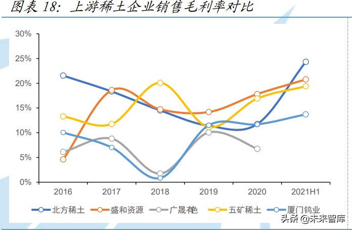 在稀土供给端受指标管控的背景下,稀土价格增长带动稀土集团盈利性提升。由于稀土 产业属于国家战略性产业,上游稀土生产配额管制使得稀土集团对中下游稀土材料加工企业的议价能力较强,因此稀土价格有望保持强势。在轻稀土价格上升叠加工信部稀土指标逐年 缓步增量的催化下,上游各个稀土集团的盈利性均有不同程度的上升。通过选取单独披露稀 土业务的稀土上市公司及稀土集团的控股子公司来看,北方稀土、盛和资源、五矿稀土的毛 利率相对同行较高,2020 年下半年起稀土涨价使各公司毛利率均有不同程度的提升,其中北 方稀土作为我国最主要的轻稀土供应商,受益于轻稀土价格的飙升,其毛利率增速大幅高于 同行;