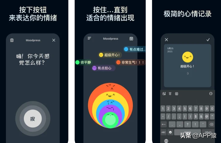 情绪指压(MoodPress)是一个记录心情的应用,也是一个非常简单的减压小游戏。您可以根据自己当前的情绪来决定指压的力度和时间(按压力度越大或时间越长,表示你越愤怒),并在合适的时机释放,以确定和记录你的心情。【无广告】