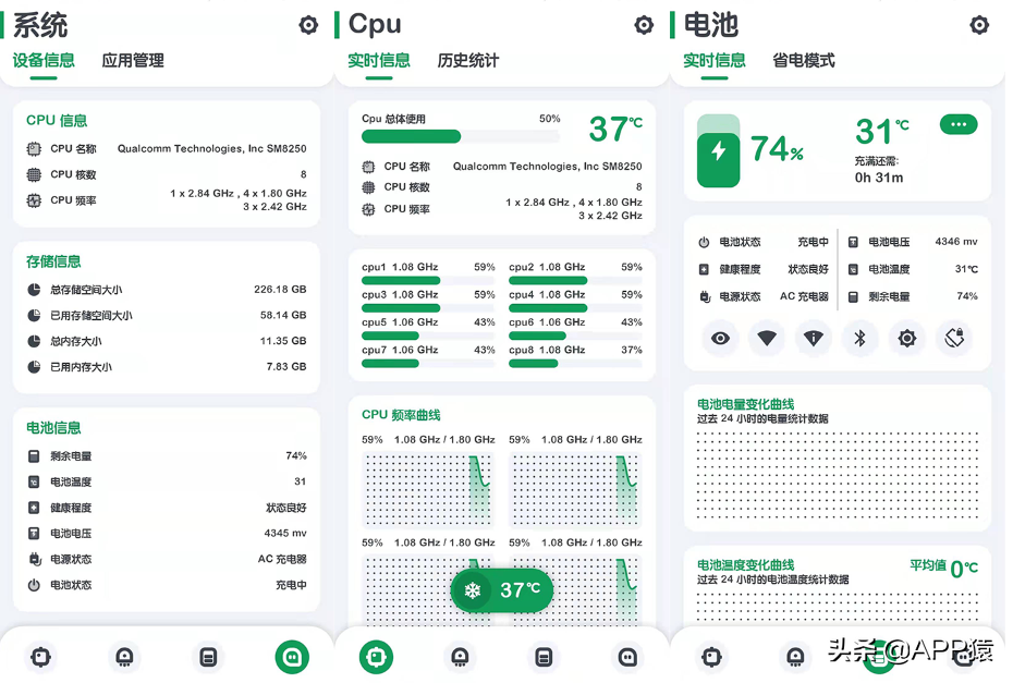 【强力检测】一款极其强大且设计简洁的系统监测软件,各种系统监测信息参数显示都很清晰明朗,包括 CPU 监测、垃圾清理、内存加速、电池监测、省电功能,你可以同时监测 CPU、存储空间、内存、应用和电池信息。