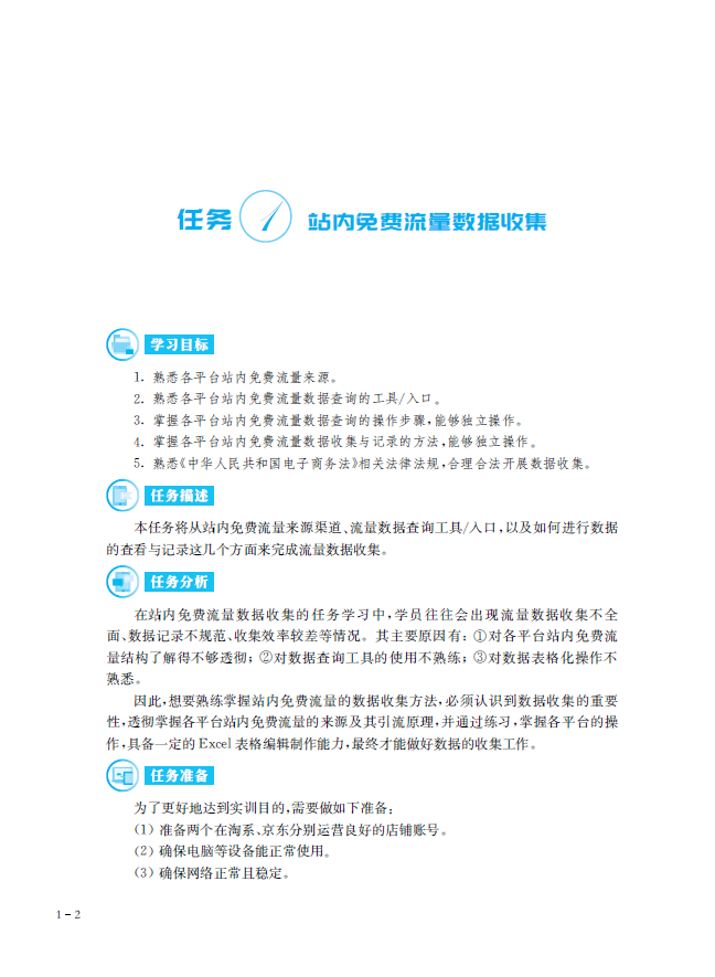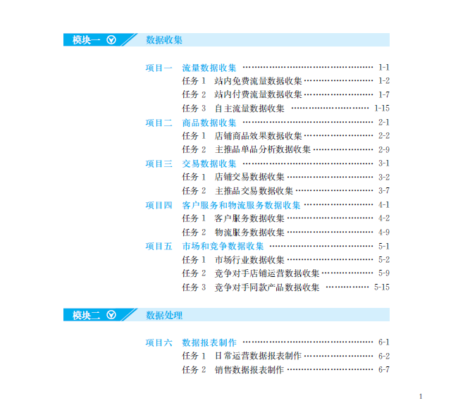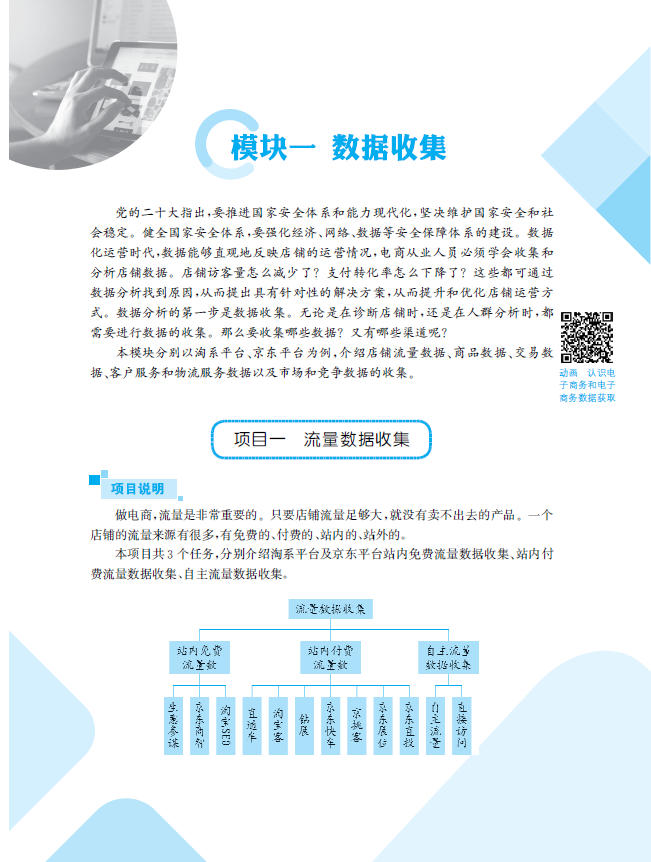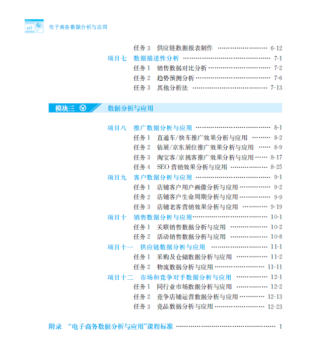 本书是电子商务专业校企双元育人系列教材之一,书中涵盖了数据收集、处理、分析与应用三大模块,并且三大模块相互关联,采取了“数据中有分析,分析后有应用”的表达思路。本书共12个项目,分为三大模块。模块一为数据收集,对电子商务数据分析背景进行大致介绍,主要内容为流量数据、商品数据、交易数据、客户服务和物流服务数据以及市场和竞争数据的收集,重点介绍了在收集不同类目数据时,应该采集的数据指标以及相应数据指标的含义。模块二为数据处理,基于Exoel表格的应用,重点介绍了数据报表制作及数据描述性分析。模块三为数据分析与应用,对电子商务数据进行了深入分析,主要针对模块一所收集的数据进行分析,并根据分析结果提出合理优化方案。通过各任务的学习,学生能够掌握电商数据分析的方法及应用,为今后进入电商企业从事数据分析与应用工作岗位打下扎实基础。