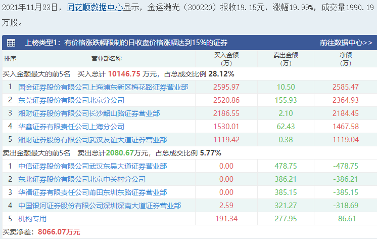 沪深交易所2021年11月23日公布的交易公开信息显示,金运激光因成为日涨幅达到15%的前5只证券上榜。金运激光当日收报19.15元,涨跌幅19.99%,换手率13.22%,成交额3.61亿元。