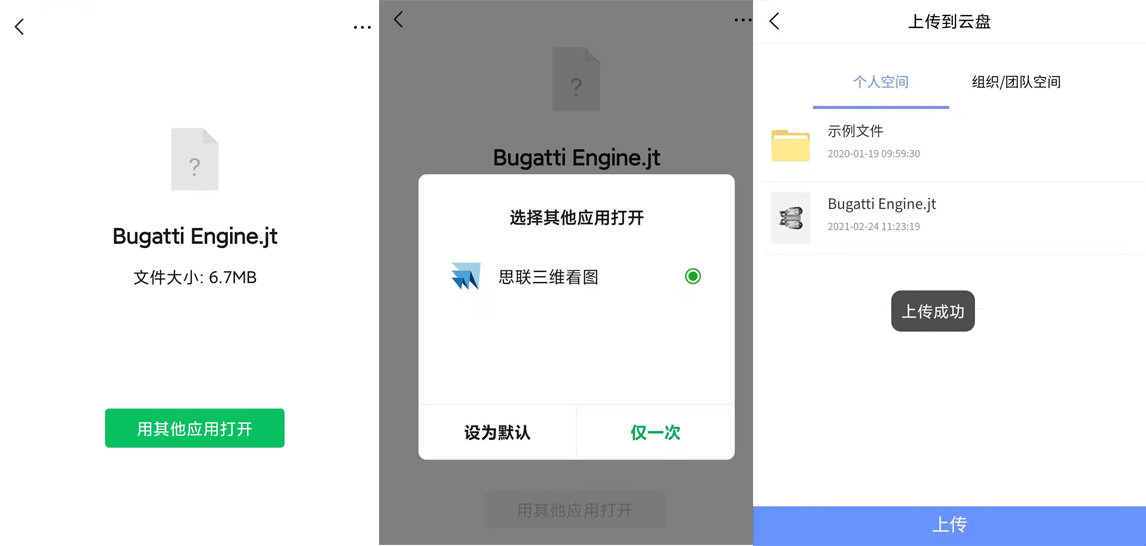首先打开收到的文件--,选择 其他应用打开,选择 思联三维看图,选择需要上传到个人空间或者是你创建的组织/团队空间(上传的组织/团队空间的文件,整个组织内的成员都可以看到,可以更方便的办公)