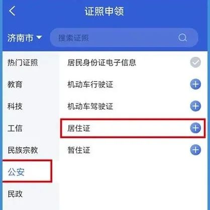 1、在“首页”找到“我的证照”,进行人脸识别认证。 2、点击页面中间的“证照申领”,选择左侧“公安”条目,点击“居住证”右侧的“+”,等待3秒钟后会关联上已有的有效居住证,并提示“申领成功”。1、在“首页”找到“我的证照”,进行人脸识别认证。