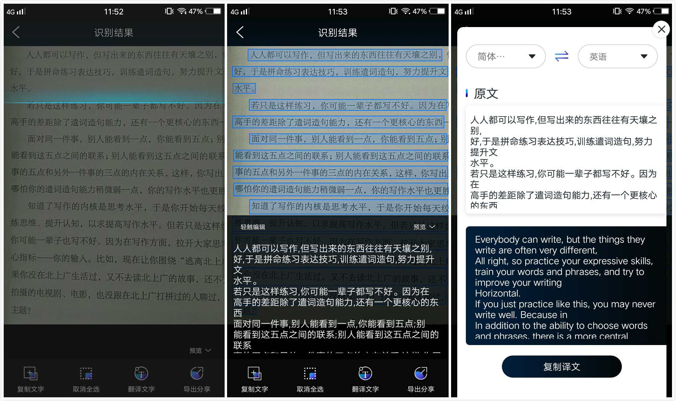 我们点击【相册】图标,然后选择要进行识别的图片,它就会自动进行识别,识别成功后,会有文字出来,这个时候,可以点击【复制文字】,进行复制;也可以点击【翻译文字】,进行翻译。