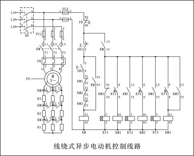 转子绕组上串联电阻来改变电机的机械特性,从而实现小电流启动、增大启动转矩及调速的目的。利用了三个时间继电器和三个接触器相互配合,启动时,串入多级电阻然后分段切除。电机的转速会逐级提高,最后达到额定转速稳定运行。