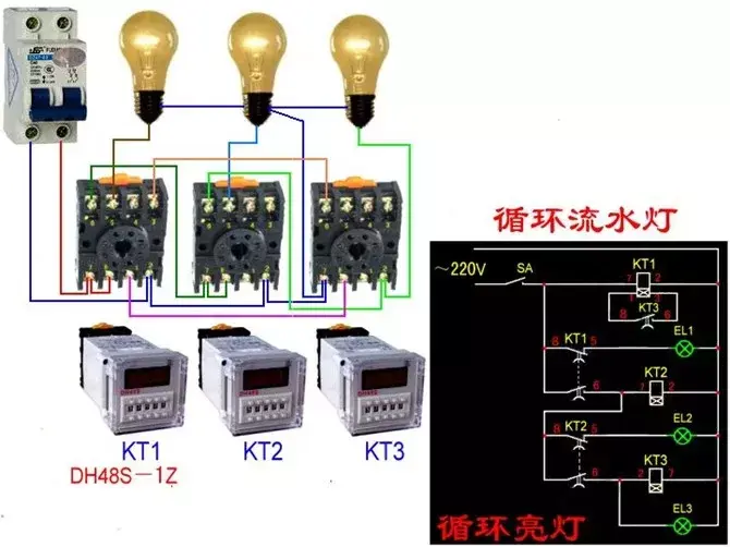 里面包含②单相电表的接线,两个⑨和一个⑩是一灯双控的接线,⑤⑥⑦⑧为日光灯的接线。这个电路非常的实用,是家装照明控制的经典案列。