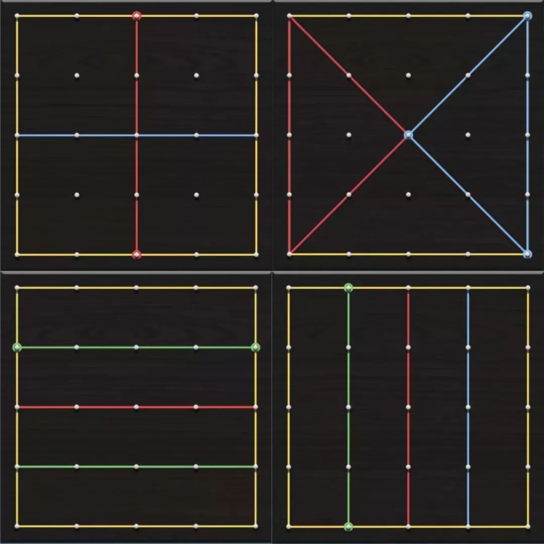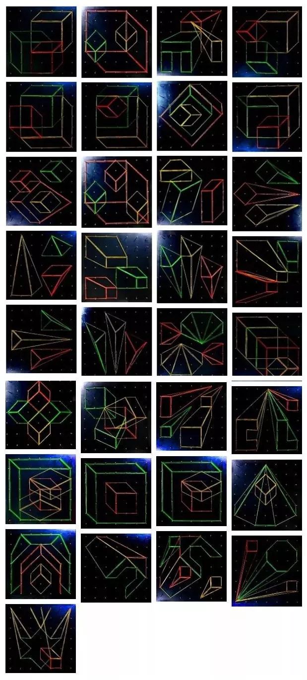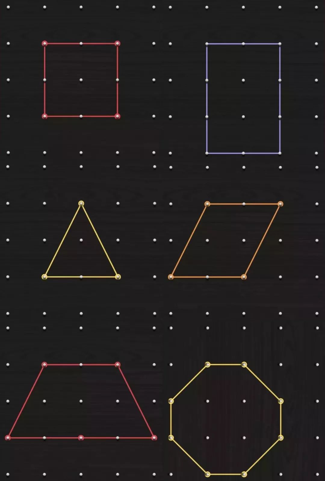 从学习角度来说,几何板最能解决的就是平面几何问题。孩子在用一条条橡皮筋连接点拼出图形的过程中,是一个主动思考的过程: