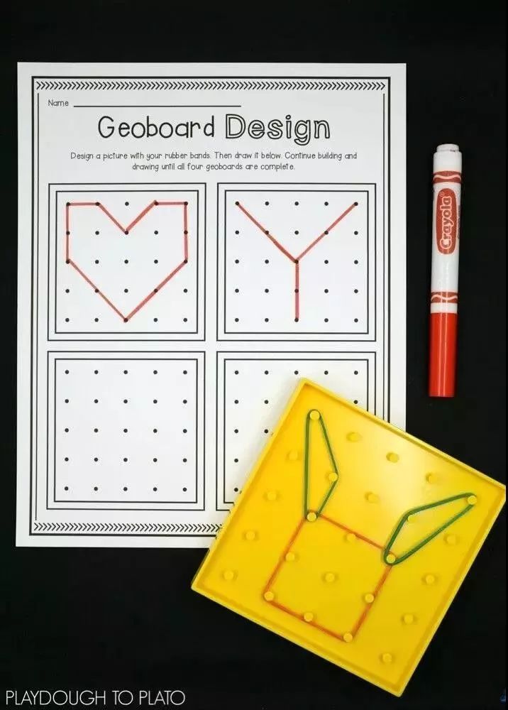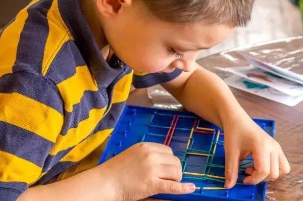 2岁左右的孩子就可以开始玩几何板了,练习把橡皮筋套在短柱上,或者拉成任何随意的形状,都是对他们手部精细运动能力的很好锻炼。