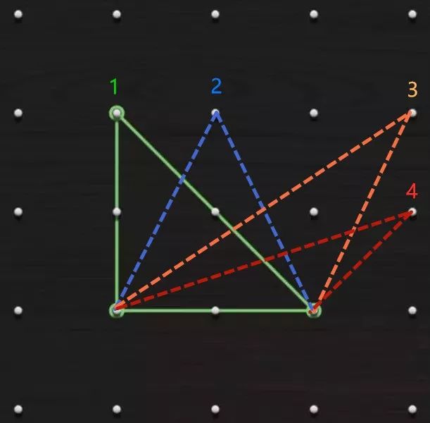 比如,把下图中皮筋的一个顶点试着往其它地方换换,孩子慢慢就会发现只要不和另两点在一条直线上就能圈出三角形。