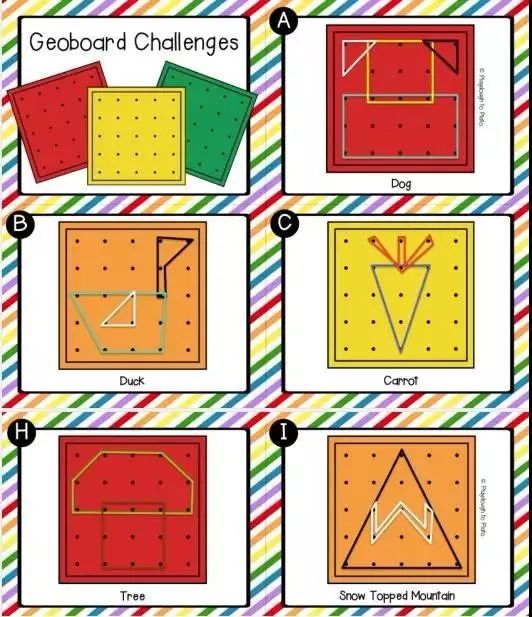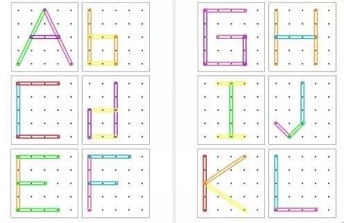 最初咱们可以先从模仿开始,给孩子一个参照物,比如图形卡,或者爸爸妈妈可根据图形卡用笔画出点状图,然后再让孩子用皮筋在几何板上复制出来。