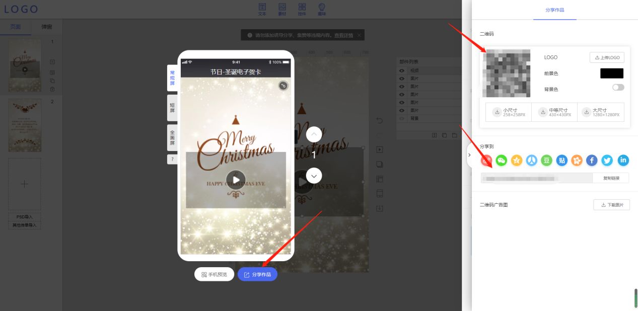 7、制作完成后就可以点击预览与设置进行查看了,点击【分享作品】自动生成码与链接可以直接分享到朋友圈、微博、微信好友等等。