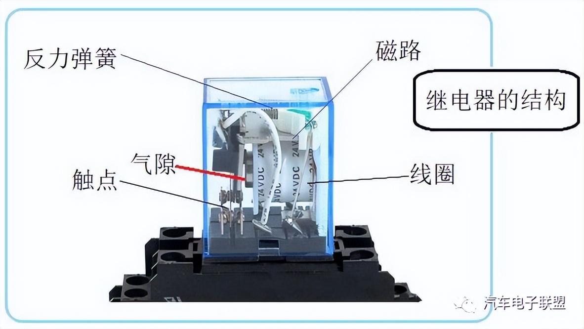 继电器由四部分构成,分别是线圈、磁路、反力弹簧和触点。