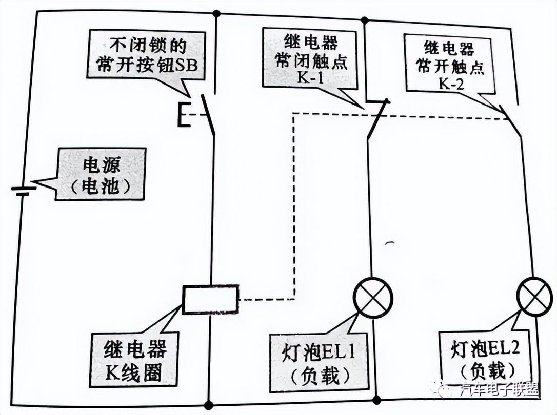 松开按钮SB时,线路断开,继电器K线圈失电,常闭触点K-1复位闭合,接通灯泡EL1的供电电源,灯泡EL1点亮;同时常开触点K-2复位断开,切断灯泡EL2的供电电源,灯泡EL2熄灭。