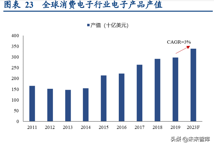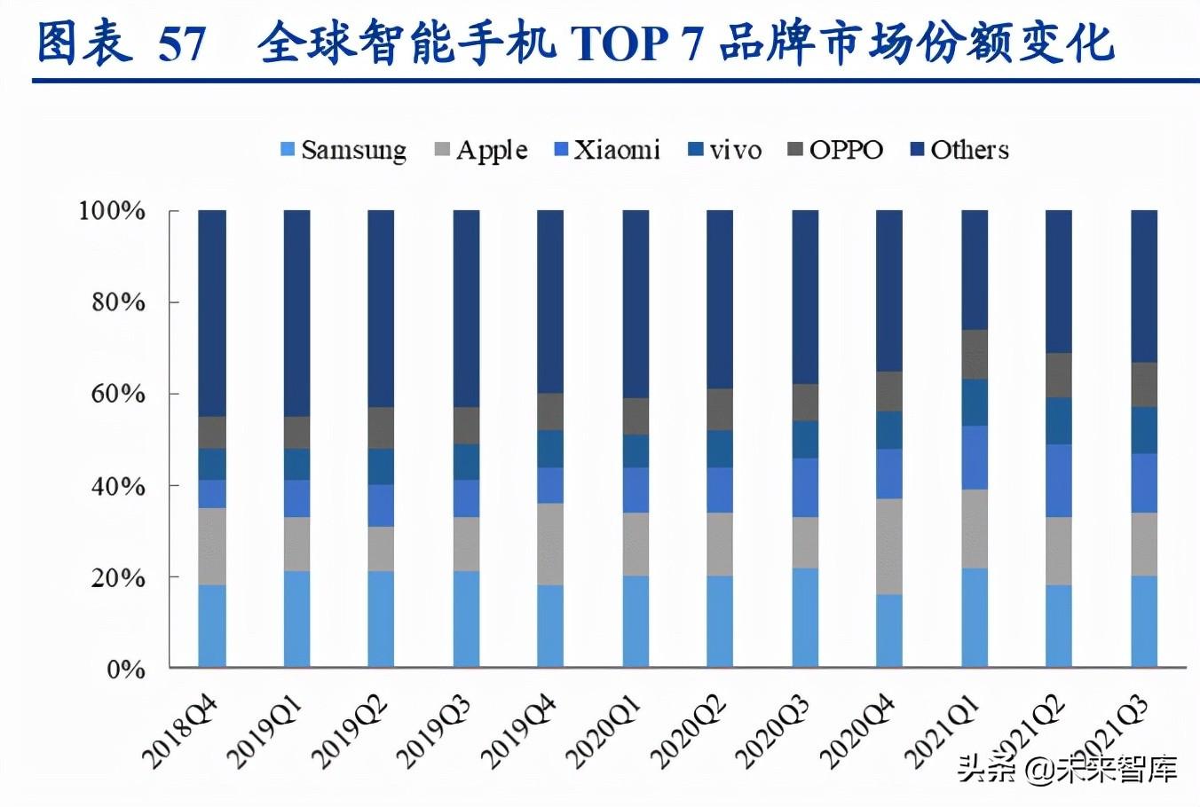 中国大陆下游品牌强势崛起,话语权增强。在 TV 领域,2016-2019 年中国一直是全 球最大的市场,2020 年被北美市场反超,在 TOP 10 品牌中,中国品牌占据 4 个,市占 率达到 38%。在智能手机领域,中国大陆占据全球 30%市场份额,2021Q3 全球 TOP 5 品牌占据 67%,其中中国品牌有 3 个,占比 33%,可以看出,中国的消费电子市场一方 面市场规模逐渐扩大,另一方面本土企业的实力和地位在不断增强。