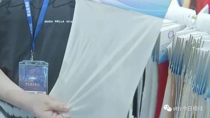 面料材料是直接影响服饰舒适感的因素,不少企业都会在这方面上狠下功夫。在汕头市怡泰成织造有限公司的展位上,一款如蝉翼般透明丝滑的布料就受到不少客商的关注。
