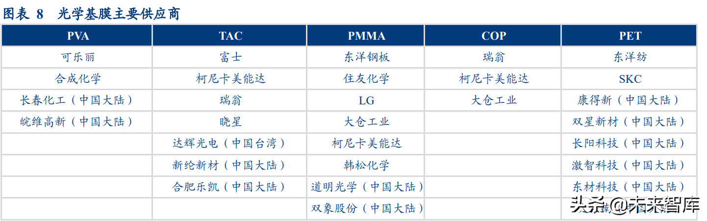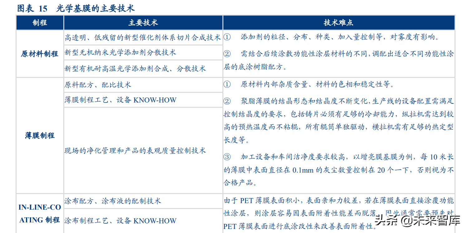 人才储备方面,光学基膜涉及高分子材料等领域,研发难度较大,而中国大陆光学 膜起步较晚,技术积累不足,该领域人才非常稀缺。客户认证方面,一般国内客户的认 证时间在 3-6 个月左右,外资客户的认证时间在 6-12 个月左右,而中国大陆光学膜生产 企业因为起步较晚,市场已被美日韩企业高度垄断,因此进入下游客户体系的难度更高。 显示行业具有技术更新迭代较快、所需光学功能膜种类较多的特征,下游客户在选择光 学膜供应商时,更加倾向于选择有光学基膜稳定供应的平台型企业,以保证供应链的稳 定性,并可根据市场需求变化及时对产线做出调整。(报告来源:未来智库)