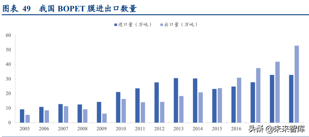 根据钟恒新材披露数据,2019 年我国 BOPET 薄膜出口量接近 50 万吨,大部分为普 通包装印刷膜;进口量在 30 万吨左右,以 MLCC、OCA 等高端光学膜基膜为主,整体 来看光学基膜市场处于供需偏紧格局。