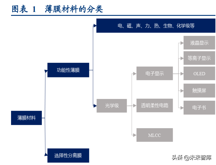 薄膜材料主要分为功能性薄膜和选择性薄膜,其中选择性薄膜主要用于水处理行业, 功能性薄膜根据特性不同,又分为电、磁、声、力、热、生物、化学和光学等。光学功 能薄膜是指具有特定光学等物理机械特性,并适用于专业用途的柔性高分子薄膜材料, 可应用于电子显示、MLCC、窗膜等领域。