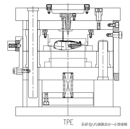 从产品图可以看出,塑件的形状为不规则的曲面,内侧有互相平行的凹槽,外侧为弧形曲面不能存在分型夹线,因此,塑件的内侧和外侧都需要滑块抽芯。塑件外形的不规则性,对于双色模具的设计和制造来说带来了很大的难度,需要很高的模具制造精度。设计的双色模具是基于日精DC120T双色注塑机的,因此模具需要两套模胚。(关于欧洲模具双色模具转盘的设计,后续转文讲解,这里不再赘述)