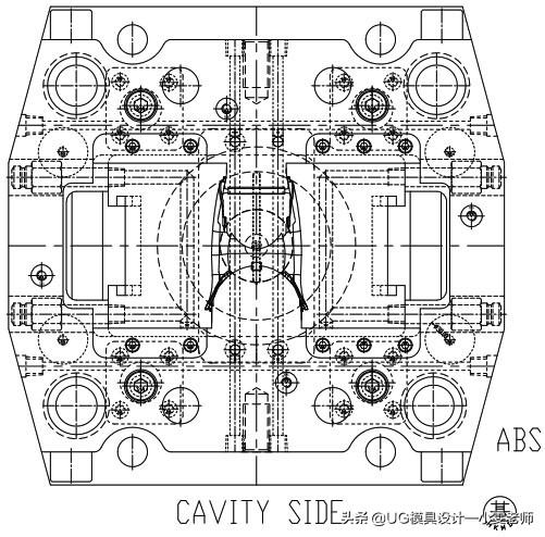 对于双色模具来说,侧向分型和抽芯机构的设计给模具设计带来很大的难度。由于两套模胚的后模是完全相同的,对于需要设计侧向抽芯的塑件,滑块尽可能设计成前模滑块,本例中,后模的内滑块,也是完全设计在后模内。尽可能避免设计后模滑块,前模铲机的结构,这种结构设计在后模旋转后,很难配合,也增加了模具的复杂性。