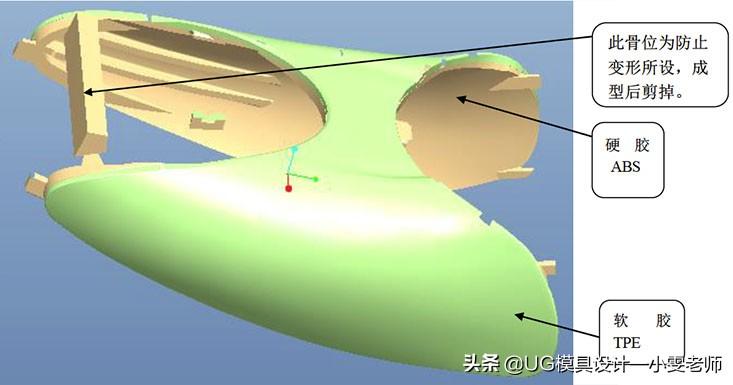 硬胶ABS采用两点进胶,一点位于塑件顶部,成型后被软胶TPE所覆盖,另一点在工艺骨位上,最后被剪掉。软胶TPE一点进胶,同样在塑件的顶部边缘,成型后产品组装时可以被盖住。