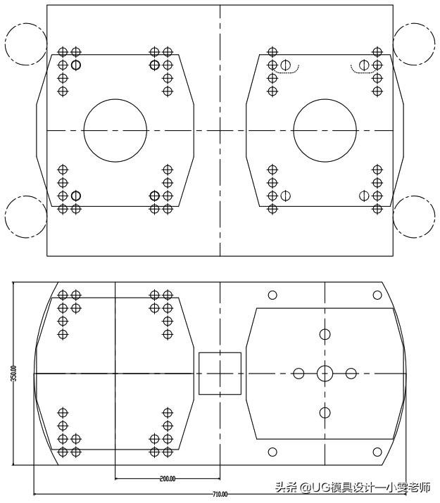 两套模胚的双色模具,具有两个完全相同的后模,而两个前模型腔是不同的,用于注射不同的物料。这就要求两套模胚完全相同,由于需要互换配合,模胚需要具备很高的精度。一般要求模具的加工精度在0.01以内。注意模胚的导柱导套孔仍然需要基准角偏置,以防加工时出错,和普通单色模具一样。另外一点需要注意的是模具必须设计成三板模的形式,在一次注塑后,二次注塑前,水口料需要及时分离。